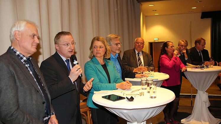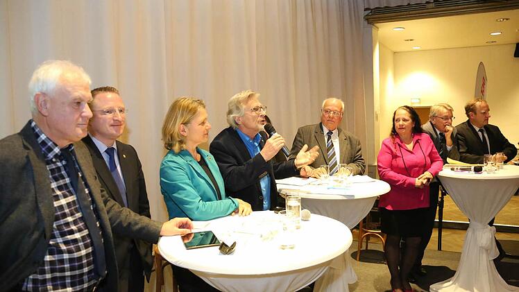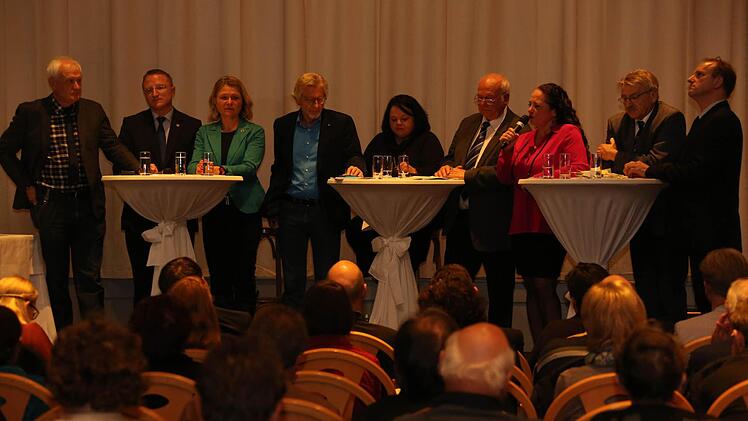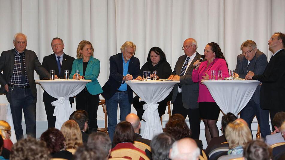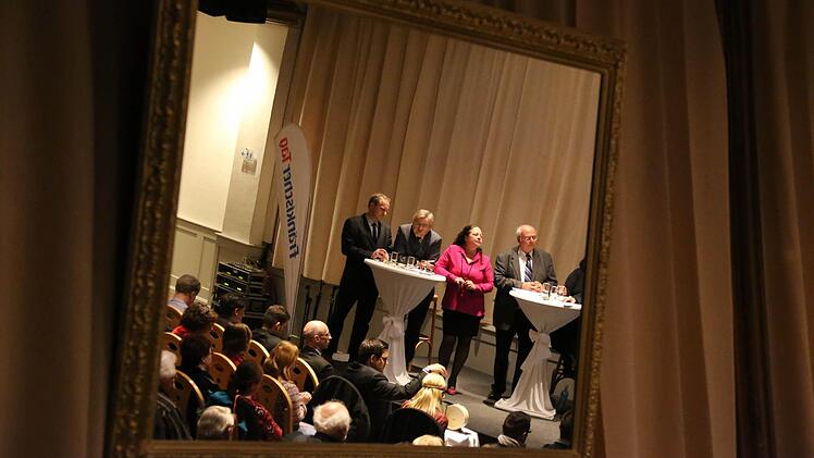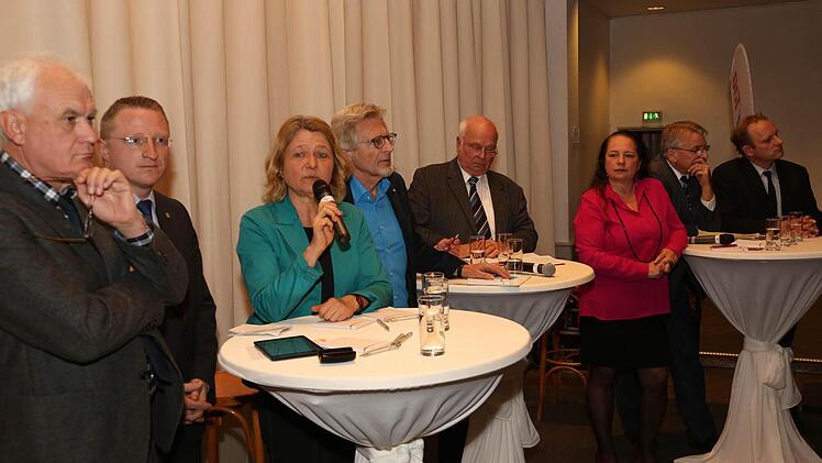 Jede der Parteien und Wählergruppen schickte einen Vertreter zur Podiumsdiskussion in die Haas-Säle: Helmut Müller kam für die CSU, Heinz Kuntke für die SPD, Ursula Sowa für die Grün-Alternative Liste (GAL), Dieter Weinsheimer für die Freien Wähler (FW), Norbert Tscherner für den Bamberger-Bürger-Block (BBB), Daniela Reinfelder für "Bambergs unabhängige Bürger" (BUB), Martin Pöhner für die FDP, Michael Bosch für die Bamberger Realisten (BR) und Anette Göpel für die "Bamberger Linke Liste (BALI).