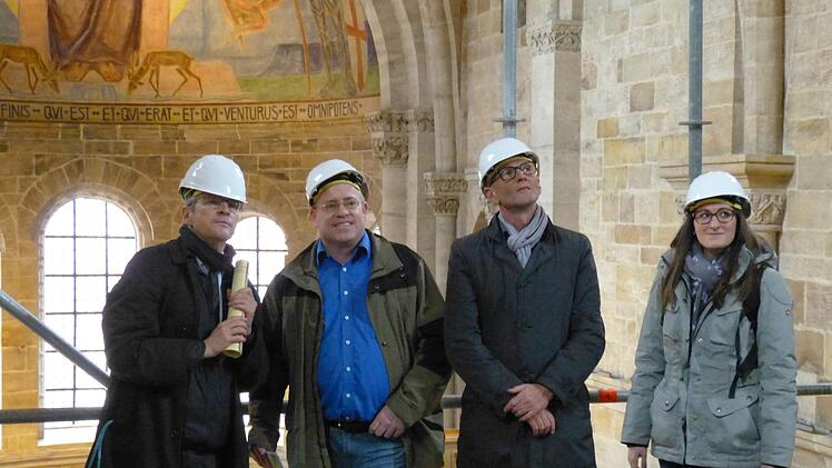 Zwölf Meter oberhalb des Kirchenschiffs knarzen die Holzplatten, als die Fachgruppe des staatlichen Bauamts zum Pressetermin einlädt. Seit Anfang des Jahres ist die Dombauhütte im Auftrag des Freistaats fleißig dabei, den Kaiserdom zu renovieren und die Sicherheit zu prüfen.