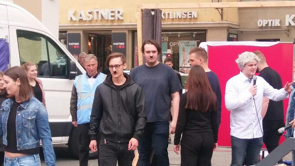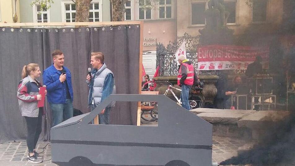 Gut 2000 Menschen schauen zu, wie IG Metall-Jugendgewerkschafter Reinders gemeinsam mit seinen Bosch-Kollegen durch die Zeiten reist: Zwischenstationen sind die Jahre 1918, 1933 und 1989. Wendepunkte der Demokratie in Deutschland und Europa. Und der Blick ins Jahr 2033? Alle Leute rennen mit Hitlerbärtchen rum. Die EU ist zerbrochen, die Demokratie ist am Ende, Franken hat sich von Bayern abgespalten - kurzer Jubel im Publikum - und Oberhaid ist die neue Hauptstadt. Und was ist die Lehre draus für 2019? "Gehen Sie zur Europawahl und geben Sie ihre Stimme für ein solidarisches und demokratisches Europa ab! Kein Fußbreit den Faschisten!", ruft Reinders den Menschen zu. Dafür gibt's viel Applaus.