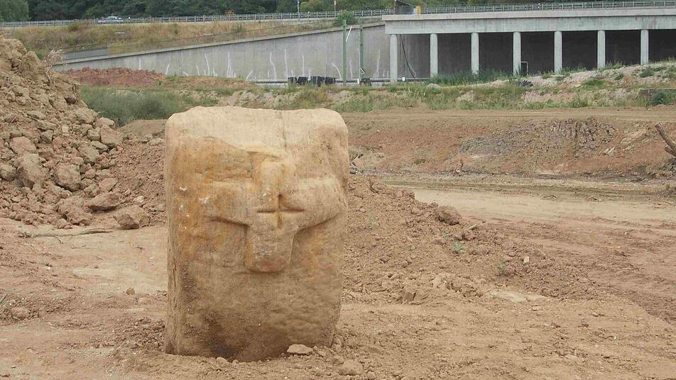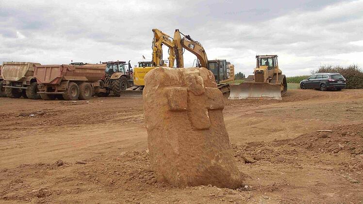 Gesehen und fotografiert haben sie das Monument an der Baustelle für das künftige neue Bett des Mains, das gerade ausgebaggert wird. Der Fluss wird für den Bau der neuen Eisenbahnstrecke nahe Ebing auf einer Länge von 1100 Metern 170 Meter weit in Richtung Westen verlegt und renaturiert.