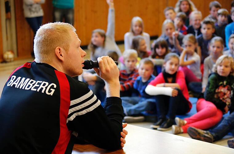 Die Spieler der Brose Baskets waren am Dienstag auf schulischer Mission: Jeweils ein Spieler besuchte eine Klasse. In Zapfendorf gestaltete Philipp Neumann mit den Kindern eine Fragestunde.