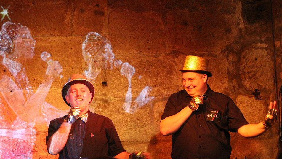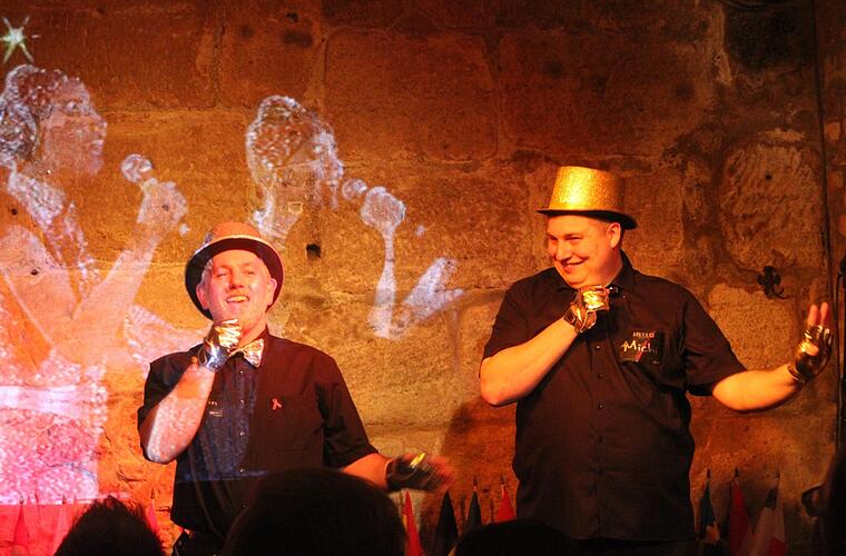 Weicher 80er-Jahre-Bass wabert durch das Kellergewölbe im mit etwa 50 Zuschauern voll besetzten Club Kaulberg. Zur einsetzenden fröhlichen Synthesizer-Melodie kommen Michael Behr und Martin Claß in golden-glitzernden Zylindern und Handschuhen auf die Bühne und singen und tanzen zur Begrüßung mit Gitti und Erika "Hallo Welt". Mit dem Lied trat das vor allem durch die "Heidi"-Titelmelodie bekannte deutsche Gesangsduo im Semifinale des Eurovision Song Contests (ESC) 1983 in Österreich auf. Das Archiv-Video des Songs ist auf die Kellerwand hinter Behr und Claß projiziert. Das gemischte, bunte Publikum singt, tanzt und lacht. Ein kleiner Vorgeschmack auf den ESC 2019 in Tel Aviv, der am Samstag ins Finale geht.