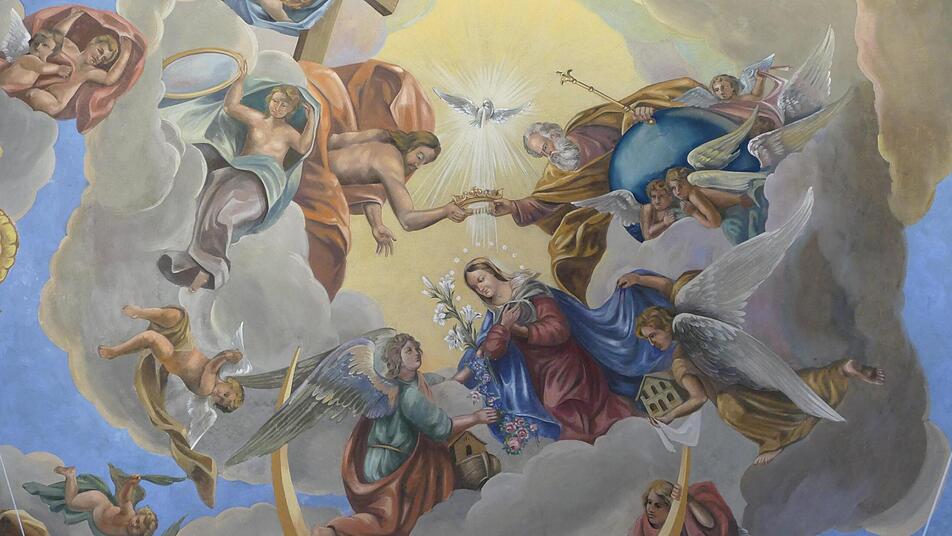 Er zeigt auf das Kuppelgemälde "Verkündigung und Krönung Mariens", das nach sorgfältiger Restaurierung wieder in seiner kompositorischen und farblichen Schönheit erstrahlt. Der Architekt erklärt die Neugestaltung und Zusammenführung der Göttlich-Hilf-Kapelle und Anna-Kapelle zu einem Raum: Werktagskirche und Taufort mit einem Altar im Zentrum. Die künstlerische Ausgestaltung stammt von Albert Ultsch: eine faszinierende Komposition aus einem vergoldeten Stahlreif als Symbol des Endlosen, Ambo, Brüstung, Bestuhlung. "In den gottesdienstlichen Feiern gibt es so ein Gemeinschaftsgefühl", ist Pfarrer Marcus Wolf überzeugt.