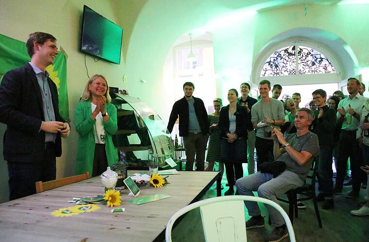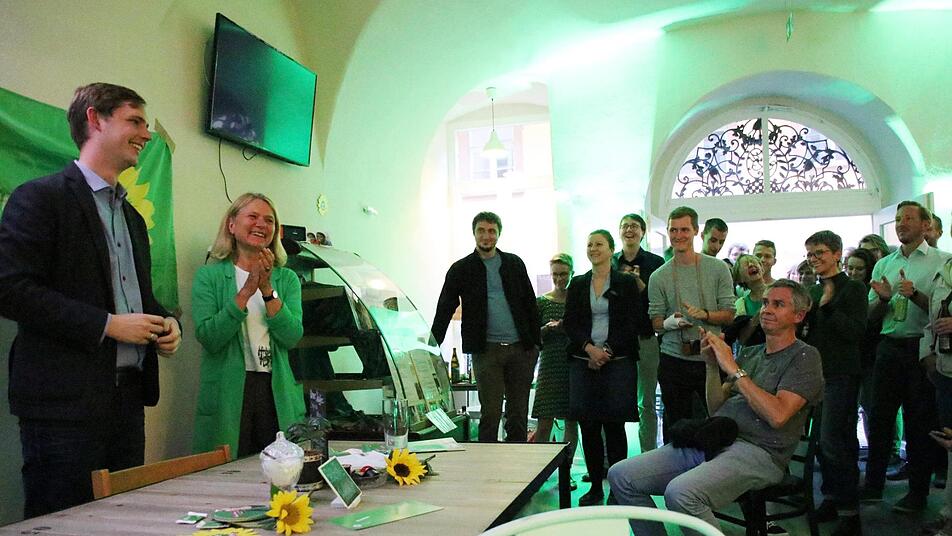 "2020 erobern wir dann die Rathäuser", sagt Grünen-Stadtrat Wolfgang Grader zum Wahlabend und stößt darauf mit Andreas Lösche an. Der hatte als Direktkandidat 2013 in Bamberg 11,42 Prozent der Wählerstimmen erhalten. Sowa konnte dieses Ergebnis beinahe verdoppeln. 2013 hatten die Grünen in Bamberg-Stadt 16,02 Prozent erzielt - nun springt die Partei im Stimmkreis sogar über 21 Prozent, toppt das landesweit ohnehin starke Ergebnis noch einmal.