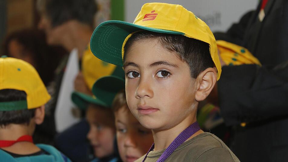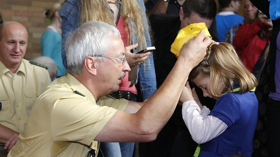 Nach einem multikulturellen Gottesdienst ging es für sie erst einmal nicht in die Unterrichtszimmer, sondern in die Sporthalle zur Klasseneinteilung. Und natürlich wurden die gelben Mützen verteilt, wie es seit Jahrzehnten Tradition ist. Diesmal war es die Gaustadter Schule, deren Erstklässler die Mützen stellvertretend für alle Schulen im Landkreis offiziell in Empfang nehmen konnten.