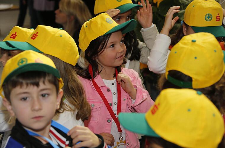 Die Abc-Schützen wurden an ihrem ersten Schultag mit leuchtenden Kopfbedeckungen ausgestattet. Sie sollen die Aufmerksamkeit der Autofahrer erhöhen und die Neulinge im Straßenverkehr schützen.