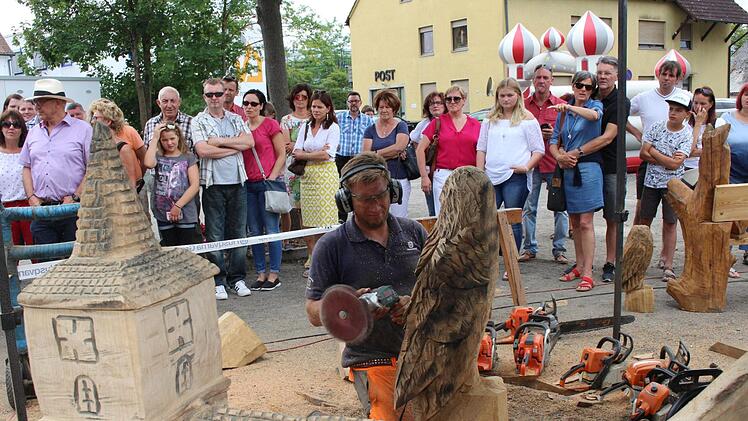 Fast ebenso gut besucht war jedoch der alte Schlüsselfelder Bahnhof. Auf dem Bahnhofsgelände wurde gesägt und geschnitzt, dass die Späne flogen. Die Thüngfelderin Resi Hofmann, Schnitzerin mit der Kettensäge, hatte Kollegen motivieren können, in das Steigerwaldstädtchen zu kommen. Bereits am Samstag hatten Resi Hofmann, Ricardo Villacis, Sebastian Seiffert, Oliver Leßmann und Anja von Grünhagen begonnen, mit der Säge Kunstwerke für den geplanten Schlüsselfelder Skulpturenweg zu schnitzen. Am Sonntag zeigten die fünf Künstler beim Speedcarving, wie innerhalb einer Stunde aus einem unbehauenen Baumstamm eine Figur entsteht.