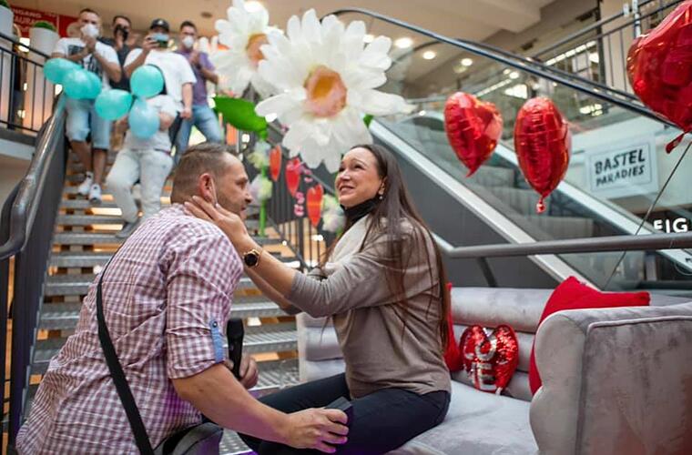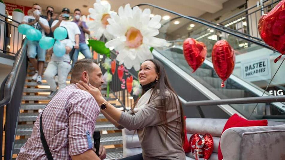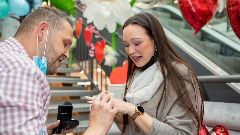 Im Ertl-Zentrum in Hallstadt wurde am Samstag (02. Oktober 2021) ein ganz besonderer Moment gefeiert. "Die Tränen sind gelaufen", erzählt Anja Hörnlein, als ihr Freund plötzlich im Shopping-Center auf die Knie ging und vor "versammelter Mannschaft" um die Hand seiner Liebsten anhielt.