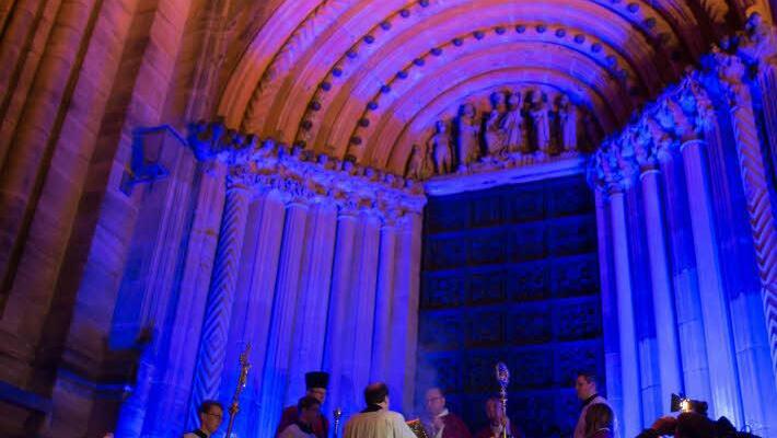 Dicht gedrängt standen die Menschen mit brennenden Kerzen in den Händen vor dem Portal: Angestrahlt in Blau als alte Kennfarbe Mariens und Erinnerung an das Wasser der Taufe, in Violett als Farbe der Buße, Umkehr und Erneuerung. Die Domkapitulare, Alt-Erzbischof Karl Braun, Weihbischof Herwig Gössl, Ministranten bildeten einen Halbkreis vor den Stufen zur Marienpforte. Ein Diakon verkündete das Evangelium: "Liebt eure Feinde; tut denen Gutes, die euch hassen...Seid barmherzig, wie es auch euer Vater ist! (Lukas 6, 27-36)