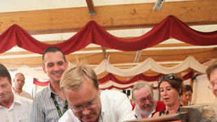 Am Abend wurde die Kirchweih offiziell durch den Schirmherrn, Oberbürgermeister Andreas Starke, eröffnet. Mit sage und schreibe zwei gekonnten und vor allem wohlplazierten Schlägen hat traditionell das Stadtoberhaupt im restlos gefüllten Festzelt das offiziell erste Bierfass angestochen. Und dies - ganz im Gegensatz zu vergangenen Jahr - ohne auch nur einen einzigen Tropfen zu verspritzen.