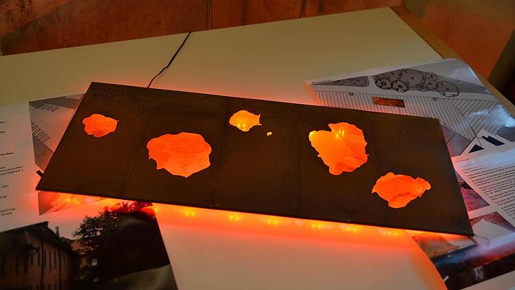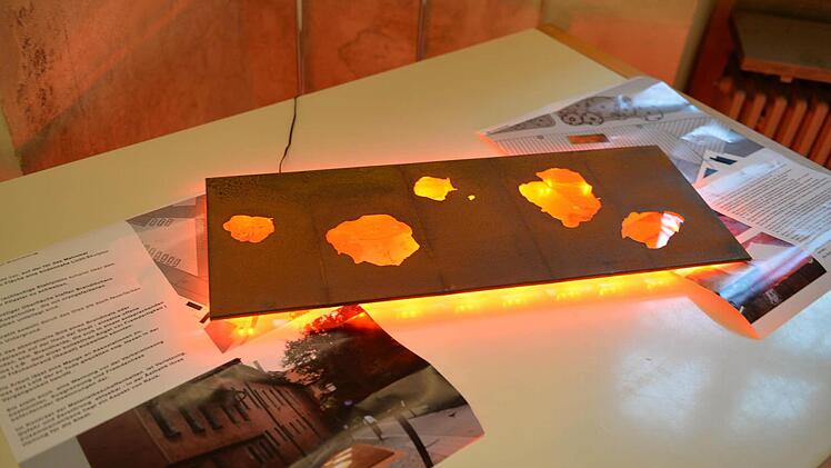 In der Oberfläche der Stahlplatte klaffen "Brandlöcher", die mit orangefarbenen Acrylglasscheiben unterlegt sind. Licht strahlt durch das Glas als auch feuerfarben auf den Untergrund. "Es wird Tag und Nacht beleuchtet sein", blickte Hubert Sandmann voraus. Ferner werde auch eine Tafel mit erläuterndem Text angebracht.