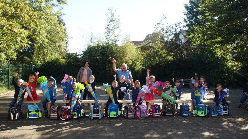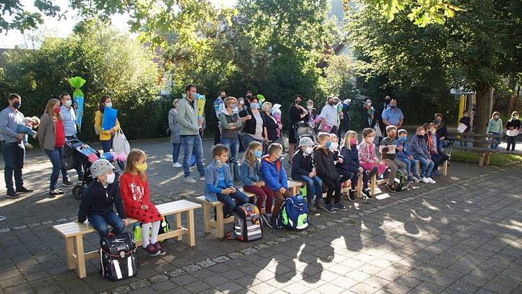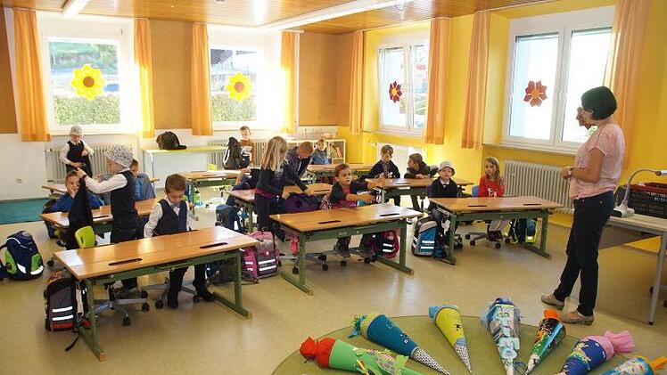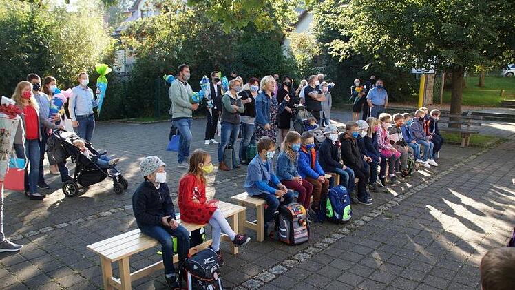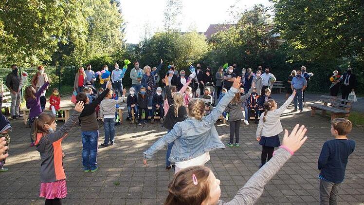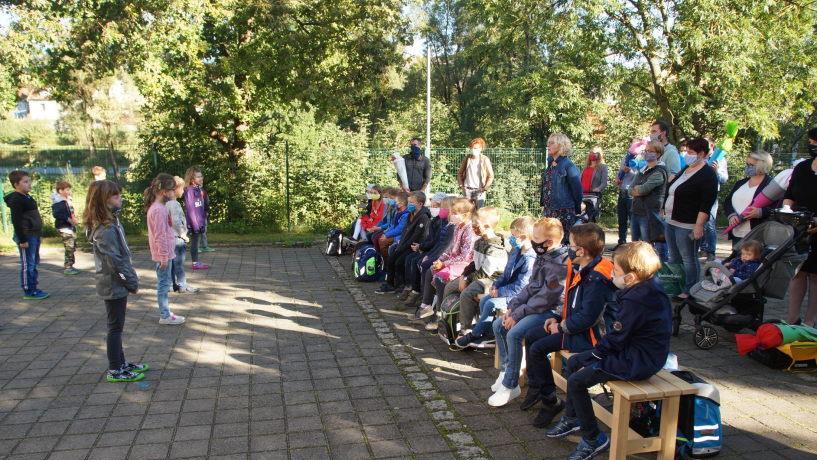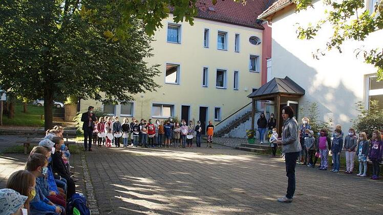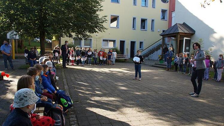 Im Pausenhof wurden Eltern und Kinder von den Zweitklässlern und ihrer Lehrerin Susanne Kröner mit dem Lied "Hipp, hopp, Schule ist top!" begrüßt. Dem stimmte auch Schulleiterin Katja Prediger, die auch die Klassenlehrerin der neuen ersten Klasse ist, zu und fuhr fort: "Liebe Kinder, ich freue mich, dass wir nun zusammen starten können." An die Eltern richtete sie die Bitte: "Geben Sie Ihren Kindern Zeit, sich zu entwickeln. Arbeiten Sie mit der Schule zusammen. Wir wollen die Kinder fördern und fordern."