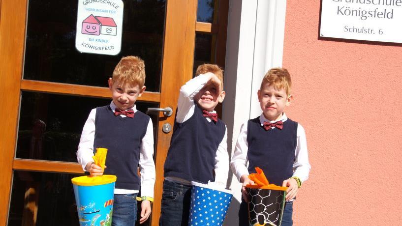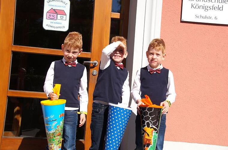 Freude herrschte auch bei Petra und Alexander Niemetz. Nach der Einschulung ihrer Tochter Alexa im letzten Jahr kamen nun Paul, Frederik und Leopold an die Reihe. Damit die Lehrerin und die Mitschüler es nicht so schwer haben, die drei eineiigen Jungen auseinanderzuhalten - denn selbst der Vater brauchte einige Zeit dazu, wie er gestand -, haben die Eltern den Kindern Uhren mit verschiedenfarbigen Armbändern geschenkt. Die Mutter, selbst Lehrerin, hatte schneller den Dreh raus, die Kinder zu erkennen. Mancher möchte aber bei den Hausaufgaben im Hause Niemetz ab und zu mal ein Mäuschen sein, um zu sehen, wie es bei vier lernwilligen Schülern dann so zugeht und wie die Mutter das dann bewerkstelligt. Bange ist ihr nicht, "denn das Gröbste ist ja nun überstanden", wie sie sagte.