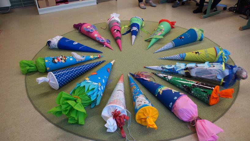 Nach der Vorstellung der Patenschüler durften die Erstklässler dann endlich in ihr Klassenzimmer und sich einen Sitzplatz aussuchen. Die Schultüten legten sie zu einem Kreis zusammen. So sollen sie zusammenhalten in ihrem Schulleben, gemeinsam wie ein Kreis stark sein, meinte dazu die Klassenlehrerin und schloss die Tür, damit der "Unterricht" beginnen konnte.