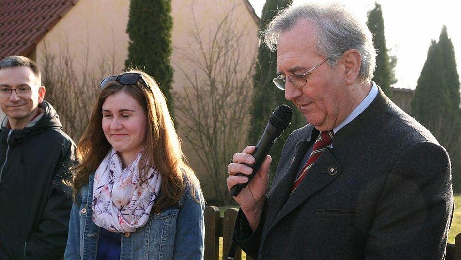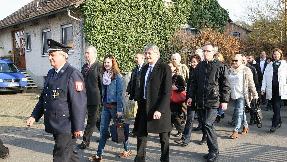 Bürgermeister Andreas Schlund hieß in der für den Verkehr gesperrten Mainbergstraße MdL Heinrich Rudrof, zahlreiche Dorfbewohner, sämtliche Hirschaider Bürgermeister-Aspiranten und die Blaskapelle willkommen, besonders natürlich die stolzen Eltern und Großeltern der kleinen Sarah.