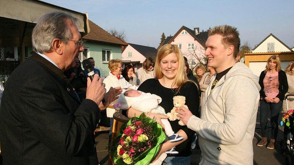 Nach einem dreifachen Hoch auf die kleine Prinzessin der Familie Fischer durfte Bürgermeister Schlund das Baby mal kurz wiegen. "Besser ein Kind in den Armen zu halten als von den Erwachsenen auf den Arm genommen zu werden," kommentierte das Gemeindeoberhaupt, das am Ende von 24 Amtsjahren noch mal so richtig Schlagzeilen macht. Die Geburt der 12000. Einwohnerin kam da wie bestellt.
