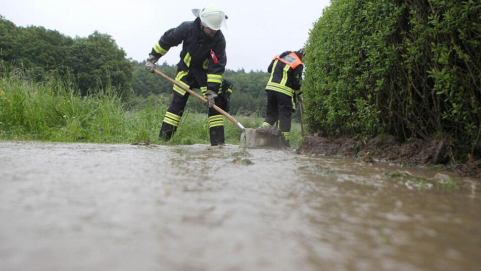 So musste die Feuerwehr bereits am Sonntagabend ausrücken, um Bewohner in Schammelsdorf (Landkreis Bamberg) vor den Wassermassen zu schützen. Das Regenwasser drohte dort mehrere Häuser zu überfluten. Die Einsatzkräfte bauten Barrieren aus Sandsäcken auf und hoben kurzerhand Gräben aus, um das Wasser umzuleiten.
