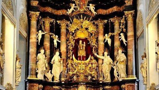 Enorme Anziehungskraft Verblüfft stellte Bambynek allein schon am Samstagnachmittag fest, welch enorme Anziehungskraft die Obere Pfarre als Bamberger Zentrum marianischer Frömmigkeit ausübt: Über 200 Interessierte strömten herbei, um die Kirchenführung durch Kunsthistoriker Walter Milutzki und Bildhauer Albert Ultsch - beide Gemeindemitglieder - zu verfolgen. Dabei gingen die Blicke der Besucher immer wieder hinauf zum Gnadenbild im Hochaltar: die sitzende Muttergottes mit dem Kind auf dem Schoß, ein Schnitzwerk aus dem Jahr 1300, das wohl in Köln entstand.Diese und andere Details hatte Walter Milutzki parat, der die Baugeschichte und Ausstattung der Oberen Pfarre erläuterte.