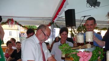 Bei der gestrigen Eröffnung gab es gleich zwei Premieren. Zum einen bekam Sandmadla Samira Wicht offiziell ihre Schärpe überreicht, zum anderen durfte Bürgermeister Werner Hipelius erstmals in seiner elfjährigen Amtszeit das erste Fass anstecken und somit die Sandkerwa eröffnen – Oberbürgermeister Andreas Starke befindet sich derzeit im Urlaub. Nach nur zwei Schlägen hieß es dann: „O’zapft is“.