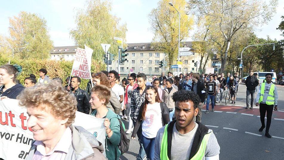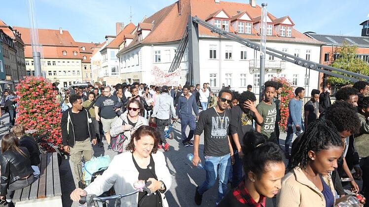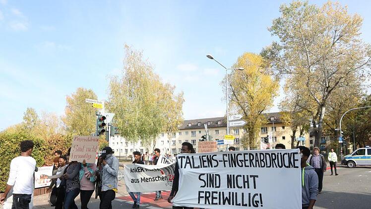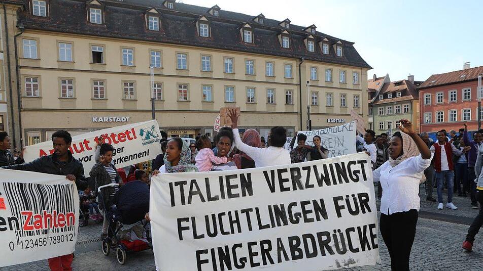 Auf Transparenten standen die Sätze, die auf dem Weg vom Ankerzentrum im Bamberger Osten, über den Bahnhof bis zum Maxplatz immer wieder skandiert wurden: "Fingerabdrücke sind keine Asylanträge" und "In Italien werden wir schlecht behandelt", hörte man die Demonstranten rufen. Dejen Hailemecheal, Mitorganisator der Demonstration, die von "Solidarity 4 All" und "Freund statt fremd" unterstützt wurde, erzählt, dass die Geflüchteten bereits auf den Booten im Mittelmeer gezwungen würden, ihre Fingerabdrücke abzugeben. Viele sind, so war zu hören, durch die Sahara, den Sudan, Libyen und über das Mittelmeer nach Italien gekommen - und von da aus oft weiter nach Deutschland.
