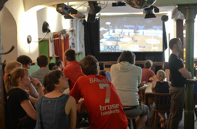 Auch über der Straße im "Live Club" hat sich ein Dutzend junger Leute niedergelassen, um die Partie zu verfolgen. Mittendrin ist Theresa Schmitz, eine Studentin aus Speyer, die unter anderem wegen der Basketball-Kultur nach Bamberg gekommen sei. Sie hätte sogar zwei Karten für das Spiel gehabt, "aber ich habe Besuch aus der Heimat und hätte drei Karten gebraucht - also habe ich verzichtet und habe eine Bar gesucht, wo es gezeigt wird."