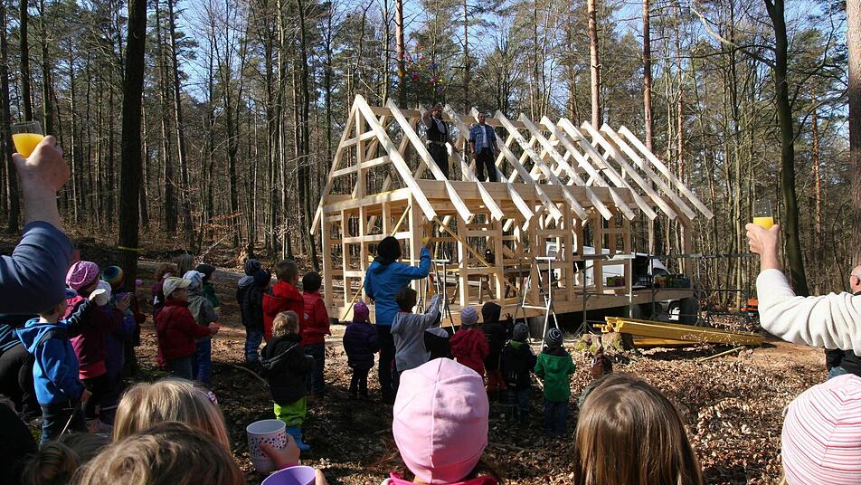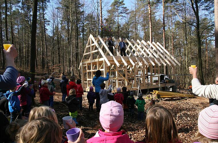 Ohne Plastik und Schnickschnack Es dauerte nach dem Richtspruch des Zimmermanns Raimund Ahles nicht lange, bis die kleinen Waldbesucher auf ihrer Erkundungstour rund um die Baustelle zu spielen begannen: ganz ohne Plastik und Schnickschnack. Aber erst einmal wurde zünftig geschmaust, Salzbrezen und O-Saft für die Kleinen, Knackwürste und Sekt für die Großen.