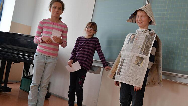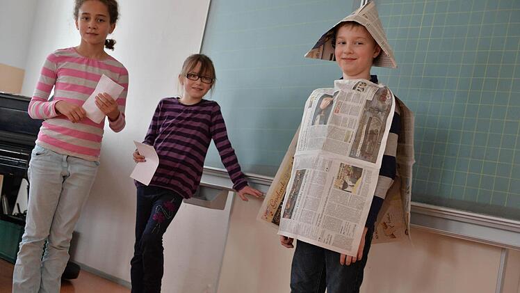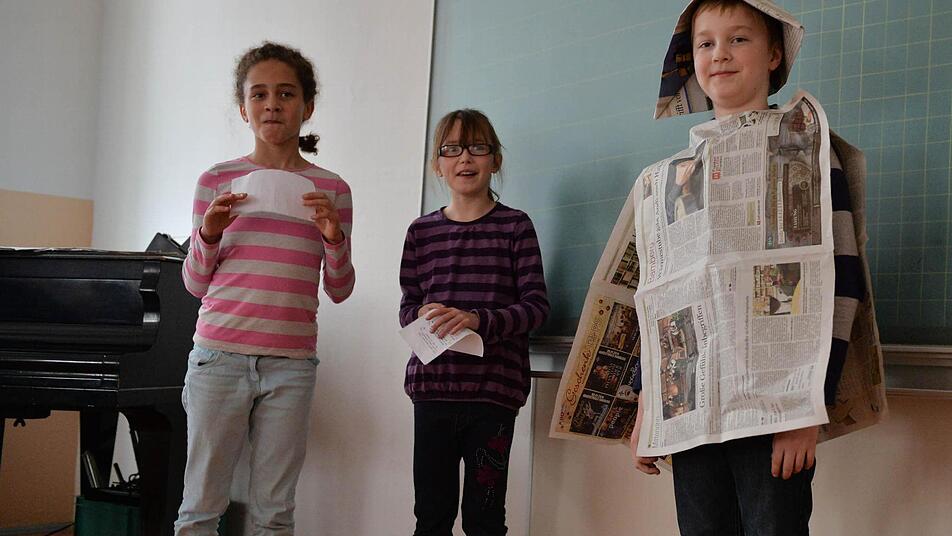 Das "Zeitungsblatt", gespielt von einem Schüler der Gaustadter Grundschule, ist die Hauptfigur in einem Stück, das drei Kinder rund um die Zeitung vortragen. "Jetzt krieg ich dich! Doch es entwischt mit 1000 Purzelbäumen", heißt es da ganz am Ende.