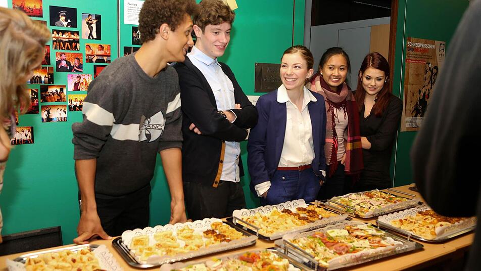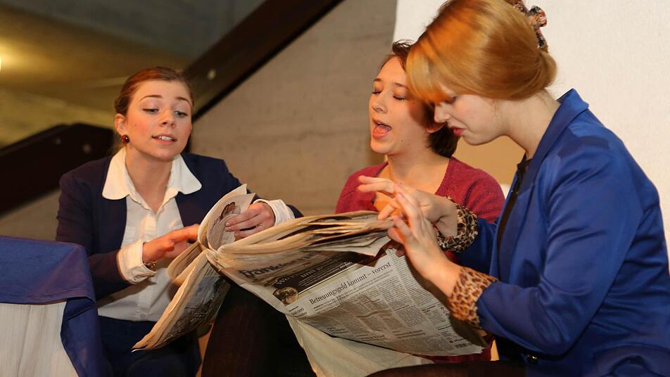 Im dem Sketch, den Schüler des Kaiser-Heinrich-Gymnasiums Bamberg (KHG) aufführten, überbieten sich Tasya Martin (Angie) und Leonie Weigt (Tanja) gegenseitig. Die Ladies beweihräuchern sich in einem Café selbst, als sich Maren Limpert einschaltet. Sie tut etwas, das die Damen nicht kennen: Zeitung lesen.