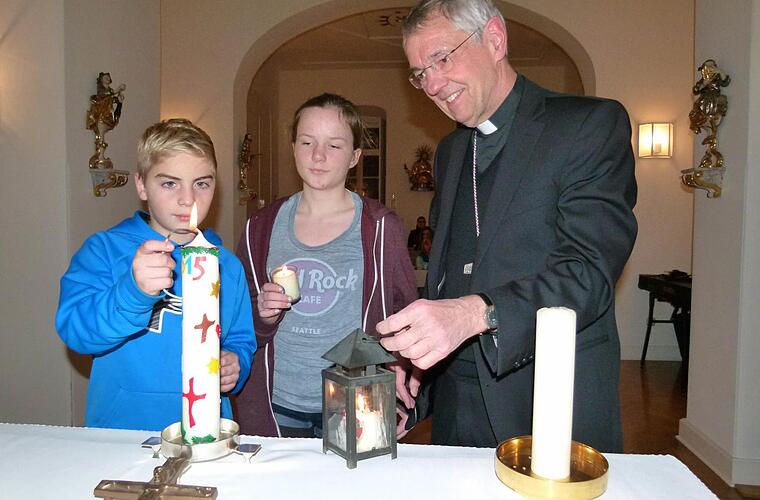 Der Erzbischof bettete die Übergabe der Flamme in eine abendliche Andacht mit Adventslied, Gebet und einer kindgerechten Weihnachtsgeschichte über einen mürrischen Hirten, der vor dem neugeborenen Säugling in der Krippe plötzlich ein weich gewordenes Herz bekommt.
