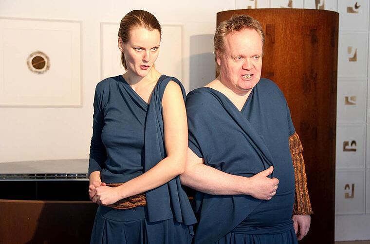 Stephan Bach und Olga Seehafer übernehmen jeweils mehrere Rollen, die sie blitzartig wechseln - eine Meisterleistung! Signalisiert wird das durch minimale Veränderungen der wallenden, antikisierenden Kostüme (Nikola Voit). So wird in Blitzesschnelle aus Ödipus die Königin Iokaste, aus dem König Polybos die Sphinx, die Stephan Bach ganz wunderbar gibt. Wartke lässt in seinem meist gereimten Text mit jambischen Rhythmus die Vorgeschichte der Handlung auch erzählen, so dass man der verwickelten Geschichte leicht folgt.