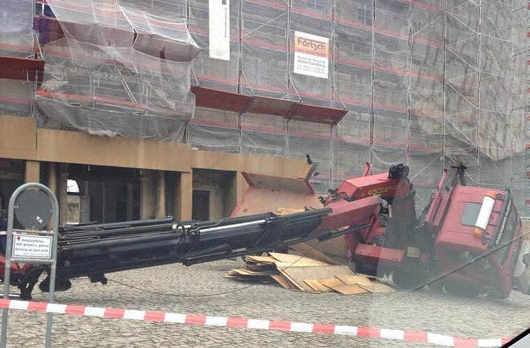 Vor der Neuen Residenz bekam Dienstagnachmittag der LKW-Kran einer Baufirma Übergewicht und kippte nach rechts zur Seite. Menschen wurden nicht verletzt.
