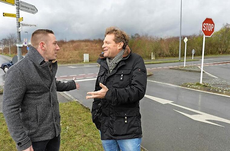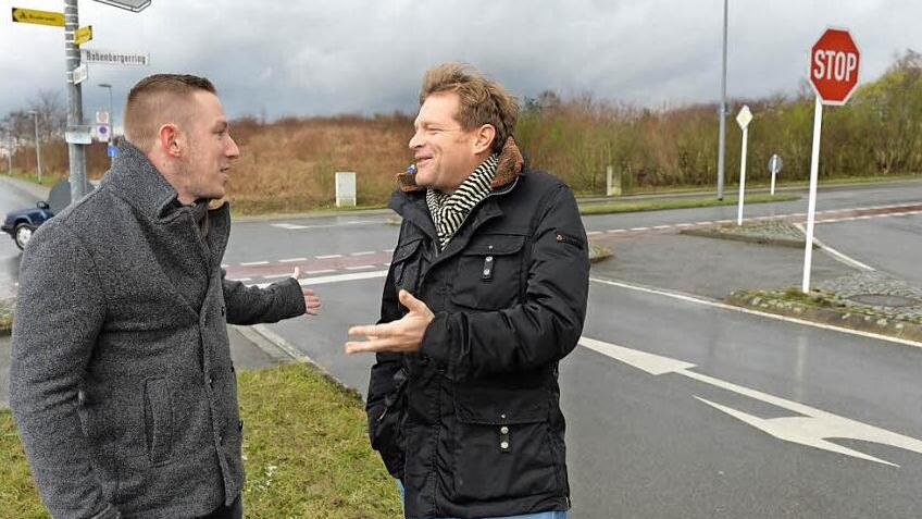 Christian Hader und Berthold Opower sind Anwohner des Neubaugebiets und treibende Kräfte der Bürgerinitiative. Sie sind froh, dass die Stadt bereits einige Sofortmaßnahmen umgesetzt hat, etwa die Hecke geschnitten und Stoppschilder aufgestellt. Foto: Ronald Rinklef