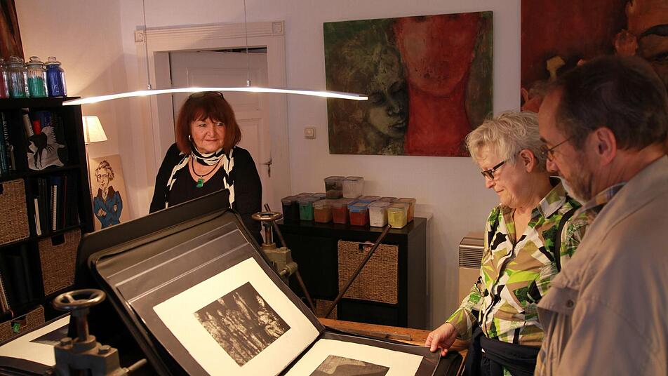Hunderte Pinsel warten in ihren Gläsern auf den nächsten Einsatz, in schwarzen Billy-Regalen schauen einem Bücher über Kandinsky und Picasso entgegen, die Couch in der Ecke lädt zum Verweilen ein. An der alten Druckerpresse in der Mitte des Raumes ist ein älteres Pärchen stehen geblieben, um sich einige Radierungen anzusehen, die dort fein säuberlich in eine Mappe einsortiert sind. An diesem Samstagnachmittag herrscht ungewöhnlich viel Trubel im Atelier von Walli Bauer. Wie viele andere Künstler hat auch sie ihre Räumlichkeiten an diesem Wochenende für die Öffentlichkeit aufgeschlossen.
