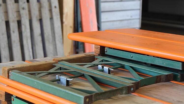 Hier fährt Jürgen Niemz mit der flachen Hand über einen orangenen Biertisch. Er richtet die Garnituren der Brauereien am Ende der Biergartensaison für die nächste her. "Jede Brauerei hat ihr eigenes Orange", erklärt er. Jürgen sei sehr penibel, ein Farb-Blättchen würde nicht lange unentdeckt bleiben, sagt ein Kollege. Das Tageslicht reicht aus, um es zu finden.