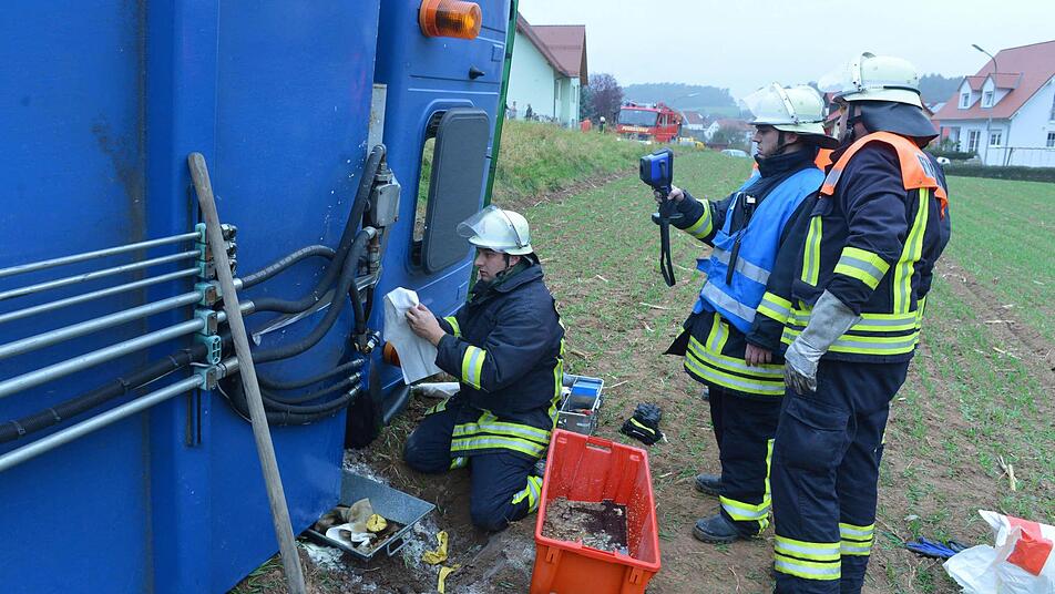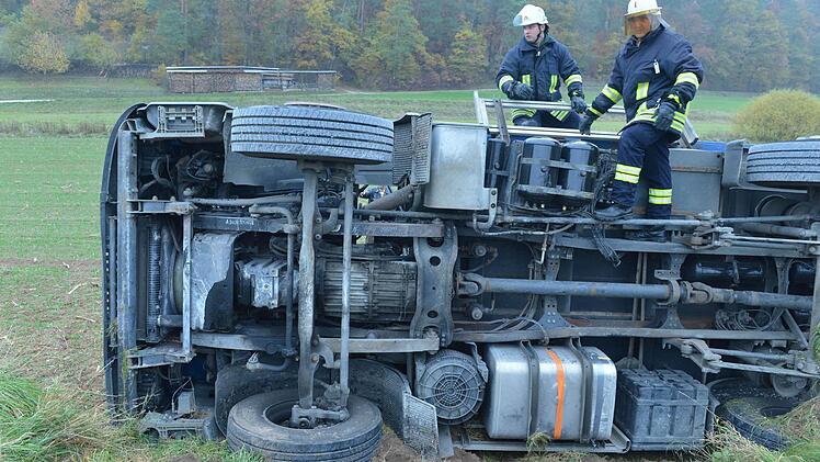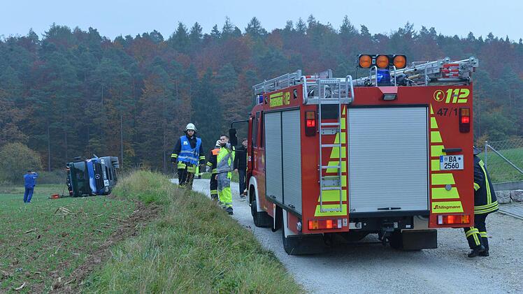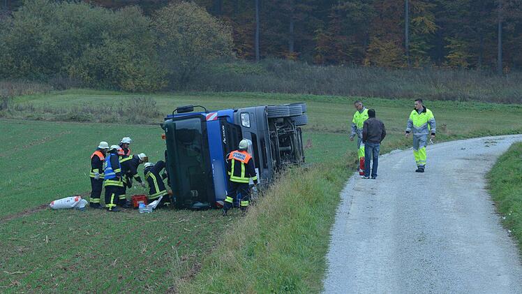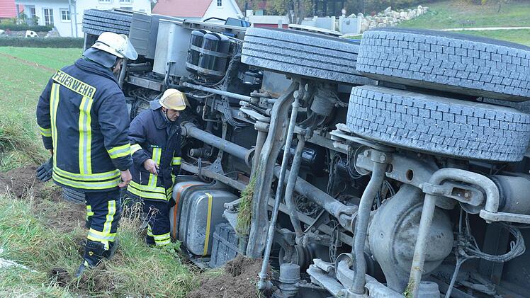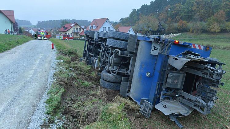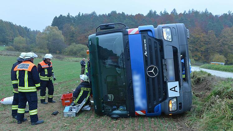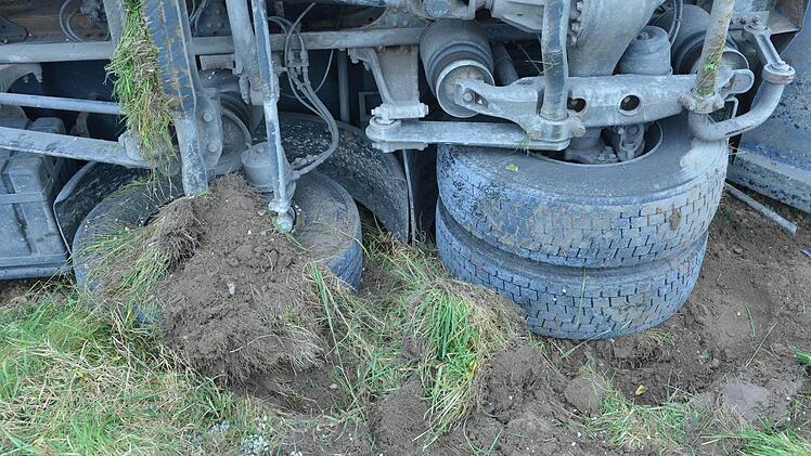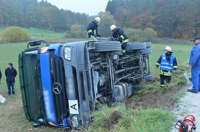 Der Unfall passierte gegen 14 Uhr. Wie ein Polizeisprecher auf Anfrage erläuterte, war der Lastwagen, der mit Müll beladen war, zu schwer für den Feldweg. Dieser gab im Randbereich nach, so dass das Fahrzeug abrutschte, umkippte und auf der Seite liegen blieb. Der Fahrer wurde leicht verletzt. Kraftstoff lief nicht aus.