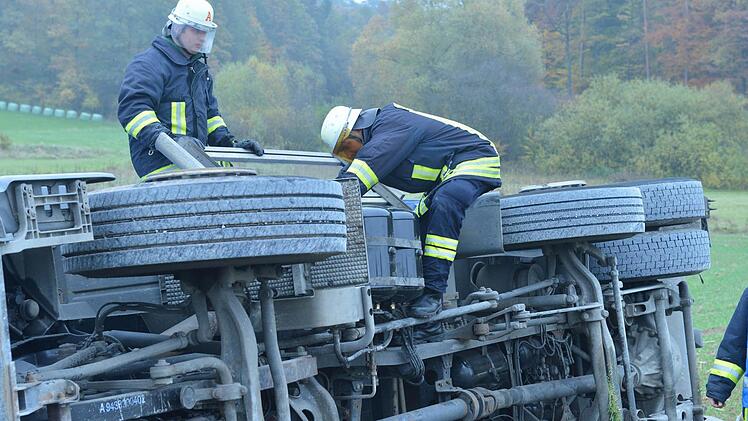 Donnerstagnachmittag wendete ein Lastwagenfahrer sein Fahrzeug am Waldrand bei Weipelsdorf (Gemeinde Bischberg). Auf dem Rückweg gab die Böschung des Waldweges nach und der Lkw kippte auf die Seite.