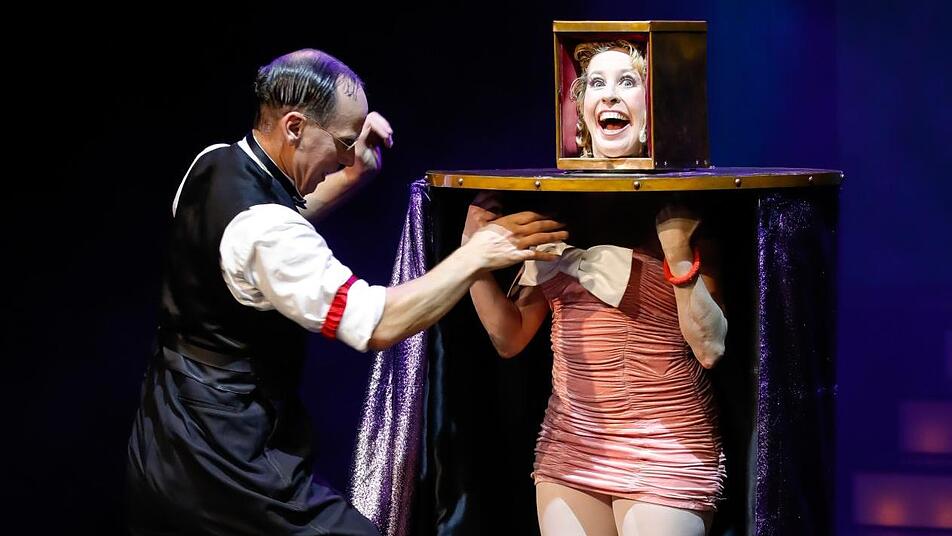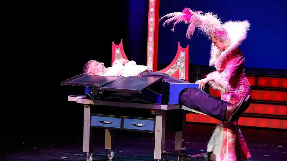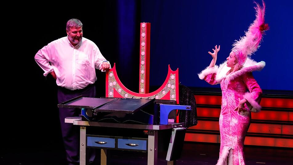 Und das kam so: Die schrille Muriel, selbst zu Beginn des Abends von ihrem Partner Scott in einer aberwitzigen Sägenummer aus einer demolierten Puppe zum Leben erweckt, tanzte zum Marilyn-Monroe-Klassiker "I Wanna Be Loved by You" durch die ersten Reihen und kuckte sich "den Klaus" als ihren Liebling aus. Mit ihrer Federboa zerrte sie ihn ins Rampenlicht und zwängte ihn in eine magische Kiste. "Das wird nicht funktionieren", dachte sich Stieringer beim Anblick des schmalen Kastens, wie er später erzählt. Und tatsächlich: Die Deckel über dem Bauch wollten nicht so recht schließen. Egal! Magier Scott setzte kreischend die Säge an, Rauch stieg auf - und auf einmal klappten die Beine des Citymanagers weg. Die Zuschauer sind verblüfft. "Ich hab' gar nichts gespürt", sagt Stieringer hinterher und freut sich, selbst auch mal Teil der Magie geworden zu sein.