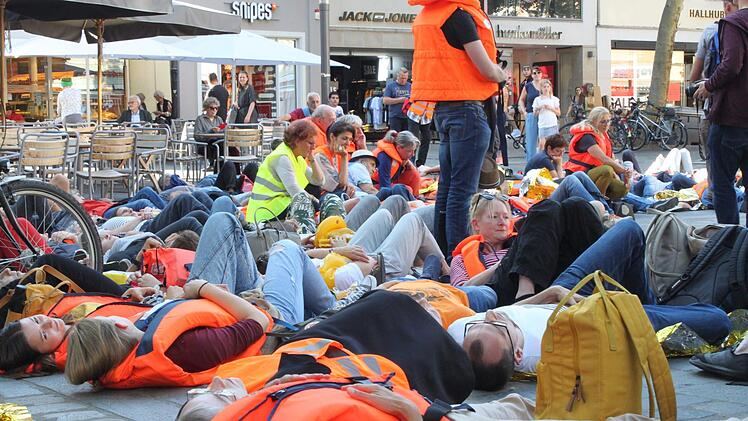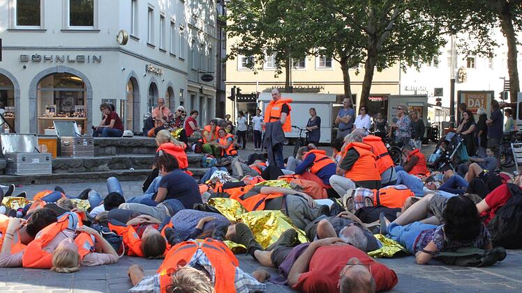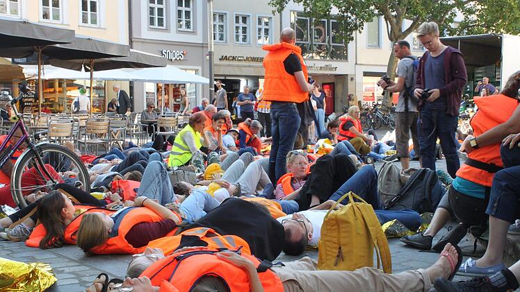 Nachdem ein Geflüchteter von seiner Überfahrt berichtet hatte, legten sich die Anwesenden auf den Boden und verharrten dort mehrere Minuten, um den im Mittelmeer gestorbenen Flüchtlingen zu gedenken.