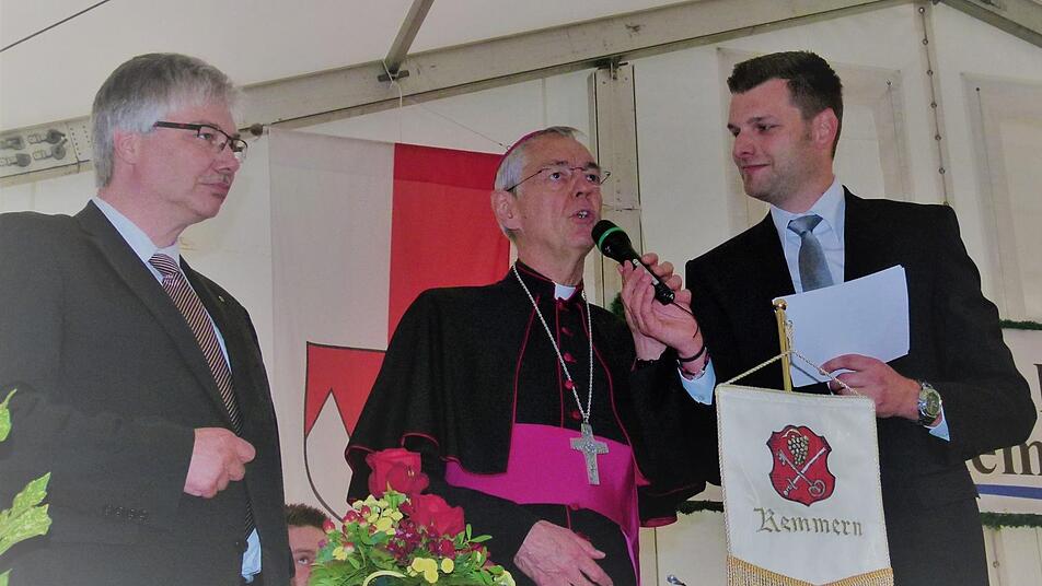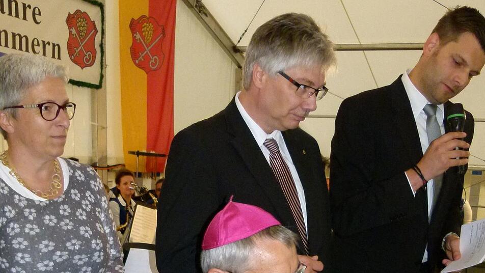 Und natürlich hörte auch Erzbischof Ludwig Schick zu, der vor dem Festakt das feierliche Pontifikalamt in der Pfarrkirche St. Peter und Paul zelebriert hatte. "Der Gottesdienst steht wie bei allen unseren Festen in der Gemeinde selbstverständlich am Beginn unserer Feierlichkeiten", spielte Bürgermeister Gerst in seinen Dankesworten an Schick auf die stets gute Verbindung von Kommune und Kirche in Kemmern an. Und bat den Erzbischof auf die Bühne im Zelt für einen Eintrag ins Goldene Buch der Gemeinde. Der Oberhirte wünschte denn auch Kemmern für das zweite Jahrtausend "Gottes reichen Segen". Sein Eintrag "sieht aus wie gemalt, den kann man auch noch in tausend Jahren lesen!", urteilte Andi Ebert, der als Redakteur des Bayerischen Rundfunks moderierend durch den Abend führte.