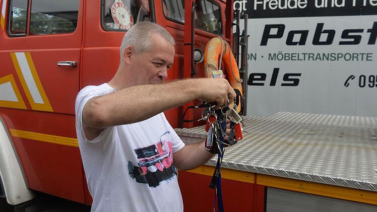 "Die Leute fragen schon immer, ob ich Backsteine in meinen Jackentaschen herum trage", sagt Matthias Schneider und lacht. Aber bei so einem Feuerwehrfahrzeug kommt man eben nicht mit einem Schlüssel aus - und der 51-jährige Bamberger nicht mit nur einem Fahrzeug.