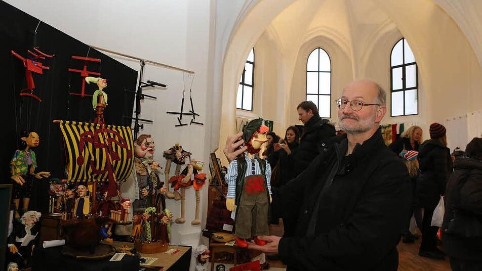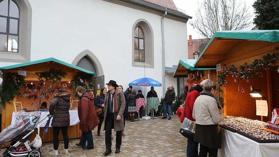geschmückte Holzhütten, in denen Kunsthandwerk wie Keramik, handgemachter Schmuck, Christbaumkugeln, Radierungen oder Zinnornamente auf hohem Niveau feilgeboten wurde. Das anspruchsvolle Angebot setzte sich an Ständen in der Johanniskapelle fort: Volkskunst aus dem erzgebirgischen Städtchen Seiffen, echte Marionetten eines Puppenbauers oder Flechtobjekte aus Weide. Fasziniert schlenderten die Interessierten wie auf einem Klangteppich umher. Denn der Gospelchor "Coloured Voices im Liederhort Hallstadt" beschwingte mit fulminant dargebotenen Weihnachtsliedern in verschiedenen Sprachen.