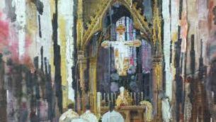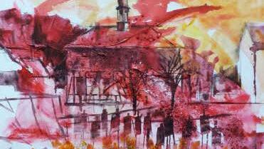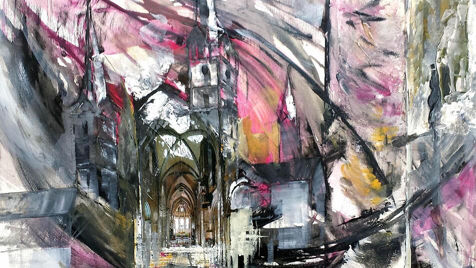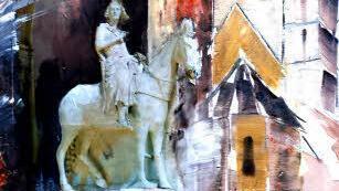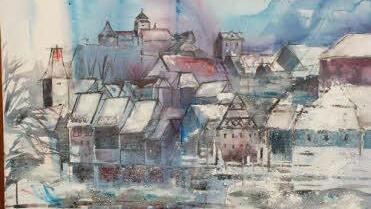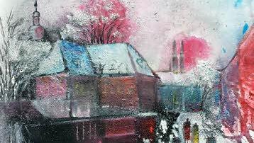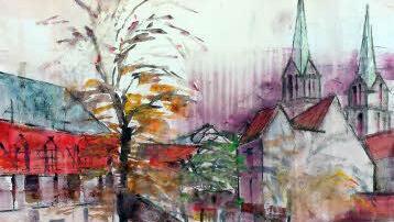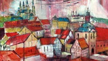 Parallel dazu entstanden in den vergangenen Jahren die Aquarelle und Acrylbilder von "Mei Bamberch". "Bamberg ist eine wunderbare Stadt - nicht zu groß und nicht zu klein, mit reicher Geschichte und doch voller Leben, das nicht zuletzt die Studenten prägen." So sieht man im April auch junge Leute am Gabelmann, nachdem der Himmel wieder blau und nicht mehr ewig grau wie sonst in der kalten Jahreszeit ist. Bei der Collage, mit der Martin Ludwig 2014 ausklingen lässt, verschmilzt das Grau des Winters mit dem Schein flackernder Kerzen. Und der Dom als Bambergs Wahrzeichen öffnet sich dem Betrachter.