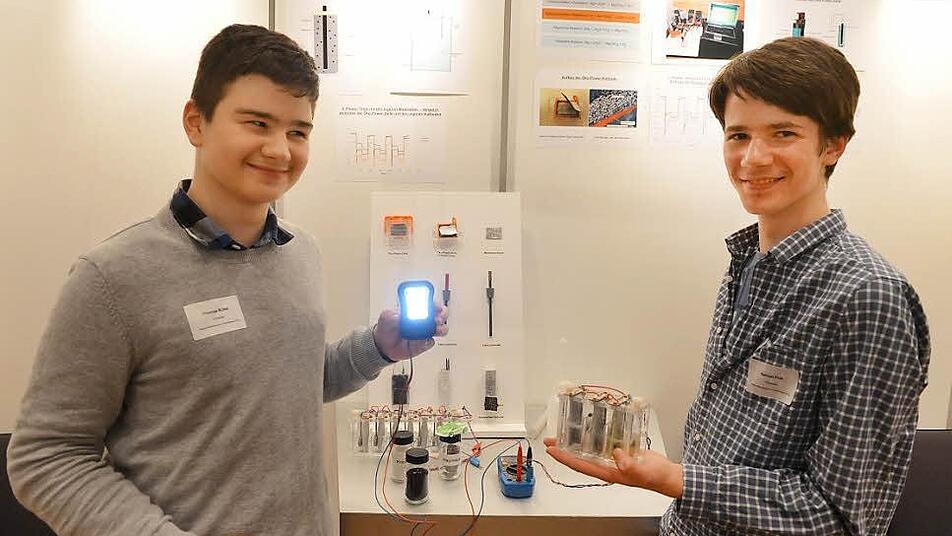 Von der Biologie gelangt man weiter zur Chemie: Der 14-jährige Thomas Büttel und der 16 Jahre alte Samuel Flink widmeten sich in ihrem Projekt dem Bau einer Magnesiumbatterie. Bisherige Batterien sind gefährlich: wegen der hohen Umweltverschmutzung und/oder der potenziellen Explosionsgefahr bei der Berührung mit Wasser. Deshalb muss etwas Neues her. Mit Salzwasser, Magnesium, Aktivkohle und weiteren Zusatzstoffen bauten die beiden Jungforscher eine eigene Batterie. "Die Lithiumresourcen werden knapper. Die herkömmlichen Batterien sind nicht zukunftsträchtig", klären sie den Laien auf.