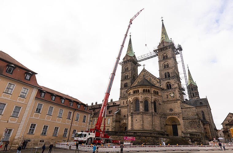 Nach knapp zehn Jahren Sanierungsarbeiten werden die Obergeschosse der beiden Osttürme am Bamberger Dom in den nächsten Tagen komplett vom Gerüst befreit. Damit sind erstmalig seit langer Zeit die vier Domtürme fast gerüstfrei zu sehen. Die beiden Westtürme waren in den 1980er und 90er Jahren saniert worden.