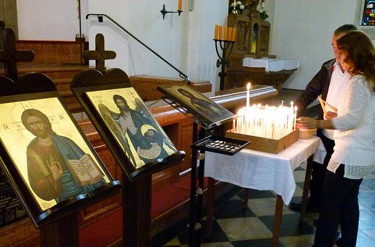 Langsam füllt sich die St. Otto-Kirche an diesem frühen Samstagmorgen. Zielstrebig gehen etliche Besucher bis an die Chorschranken, halten inne. Dort ruhen auf Ständern für diese römisch-katholische Kirche ungewohnte Tafelbilder: fünf Ikonen, die sonst nur in den Ostkirchen zu sehen sind. Die Gläubigen bekreuzigen sich, beugen sich über die Ikonen, küssen sie. Dann werden dünne Opferkerzen entzündet und in das mit Sand gefüllte Kästchen gesteckt. Wieder ein Kreuzzeichen.
