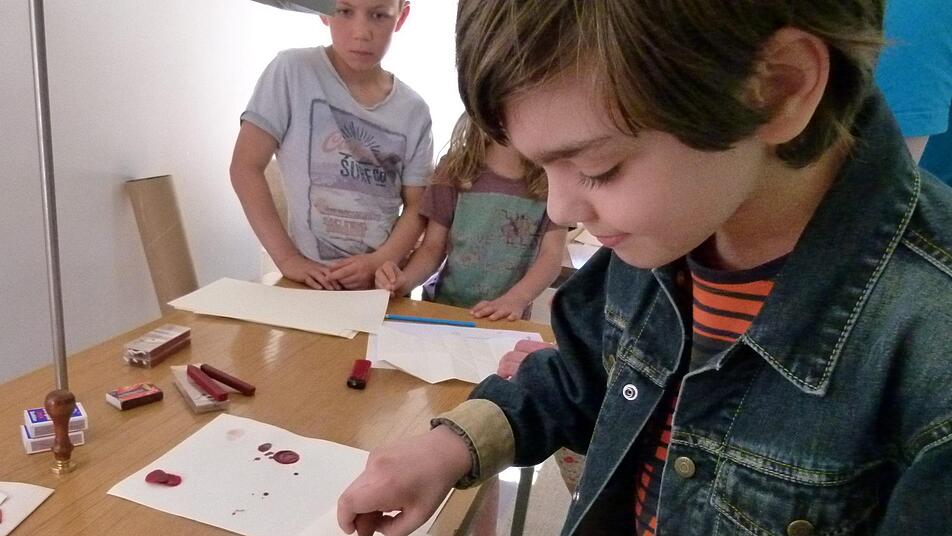 Im Historischen Museum hatte Museumspädagogin Christina Wendenburg die jüngsten Schatzsucher im Visier. Kindgerechte Rätsel schickten die Buben und Mädchen kreuz und quer durch das Museum: Eine Rallye auf der Jagd nach Tieren auf Gemälden, an der auch die Eltern ihre Freude hatten. Nachhaltig dürfte sich die Mutter des zehnjährigen Nikita über sein Geschenk zu ihrem Ehrentag freuen, das er ihr aus der Staatsbibliothek mitbringen wollte: Wie zu alter Zeit hat der Junge mit Feder und Tinte ein Brieflein an die Mama geschrieben, es zum Kuvert gefaltet und mit rotem Siegelwachs verschlossen. Die Studierenden Alexander Pelz und Yvonne Spindler vom Projekt "MimaSch - Mittealter macht Schule" der Universität Bamberg hatten alle Hände voll zu tun, weitere kleine Schreiberlinge im richtigen Gebrauch der Utensilien anzuleiten.