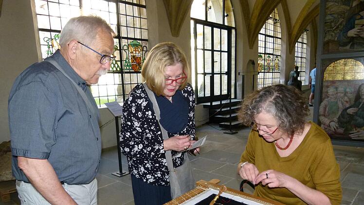 Umso faszinierter standen die Beiden vor dem Stickrahmen, an dem Textilrestauratorin Sibylle Ruß goldene Fäden auf Seide zu Buchstaben legte. Sie demonstrierte damit, wie der berühmte Sternenmantel Kaiser Heinrichs II. seine Goldstickerei erhalten hatte. Und bei der kniffligen Arbeit mit Nadel und rotem Haltefaden erzählte Sibylle Ruß über all die Kaisermäntel im Diözesanmuseum, die weltweit einzigartig sind. Selbstredend, dass ihre Zuhörer diese kostbaren Textilien einen Stockwerk höher auch selbst in Augenschein nehmen wollten.