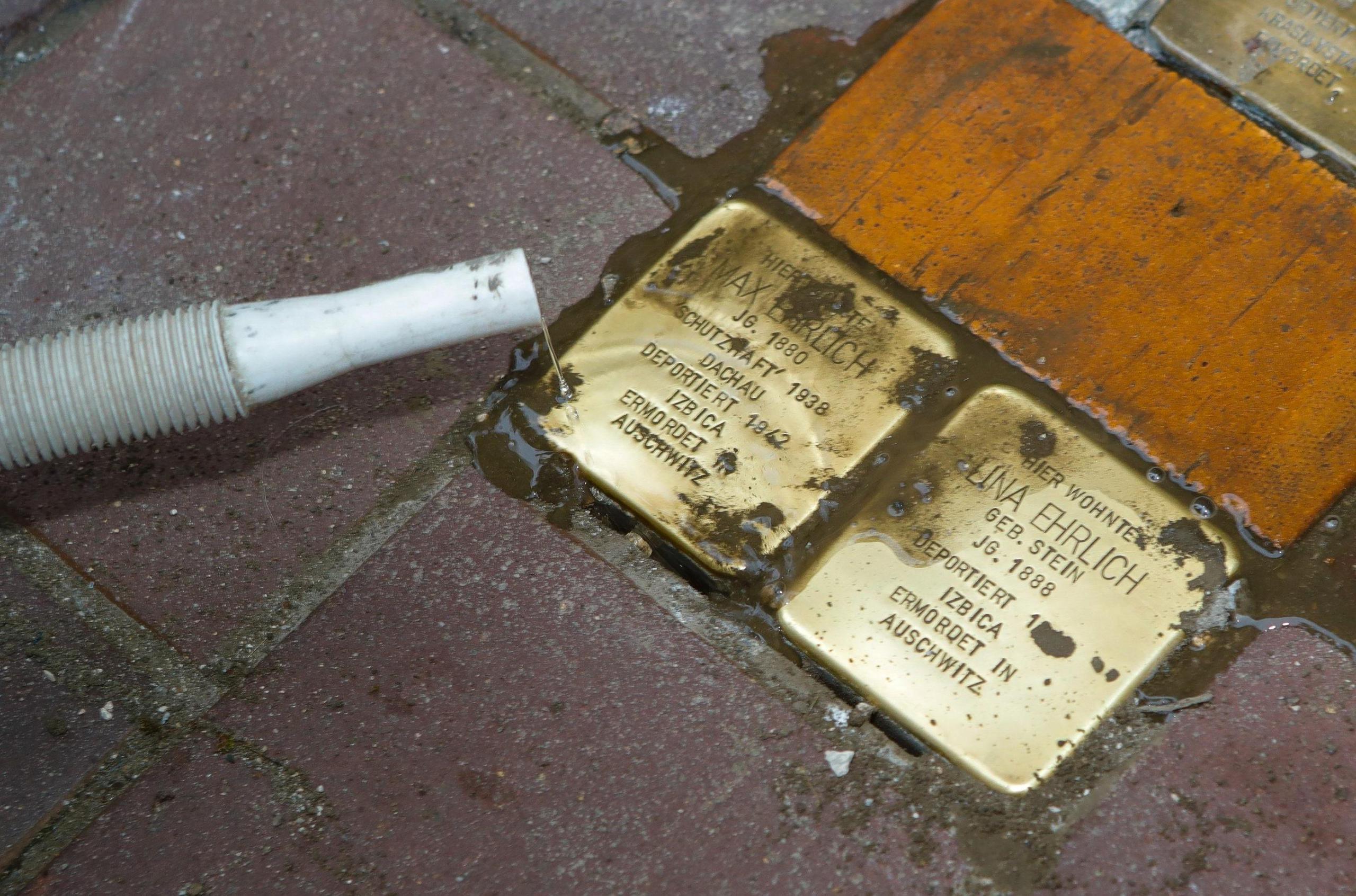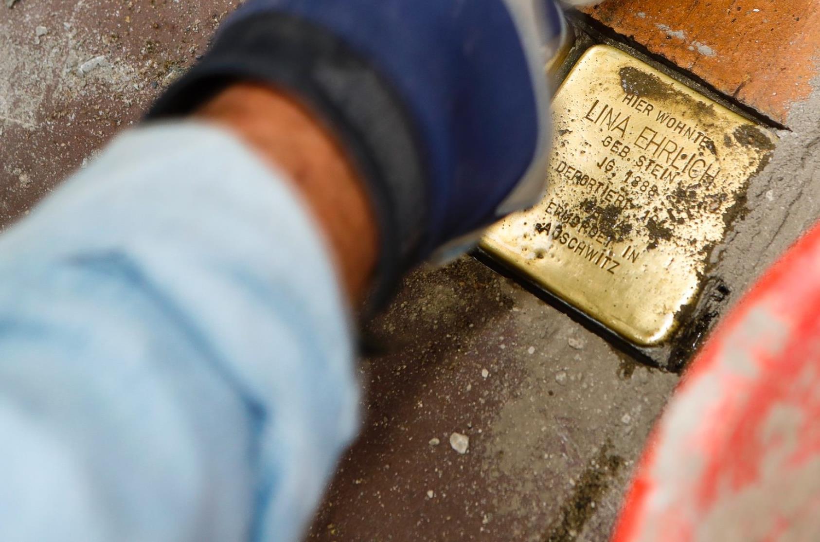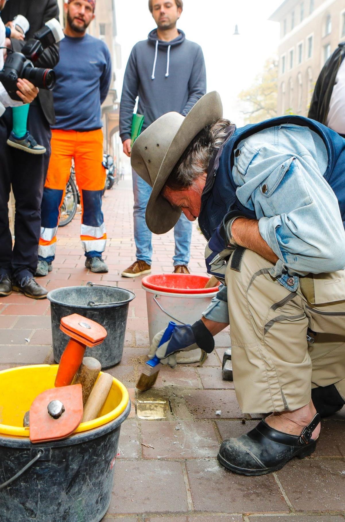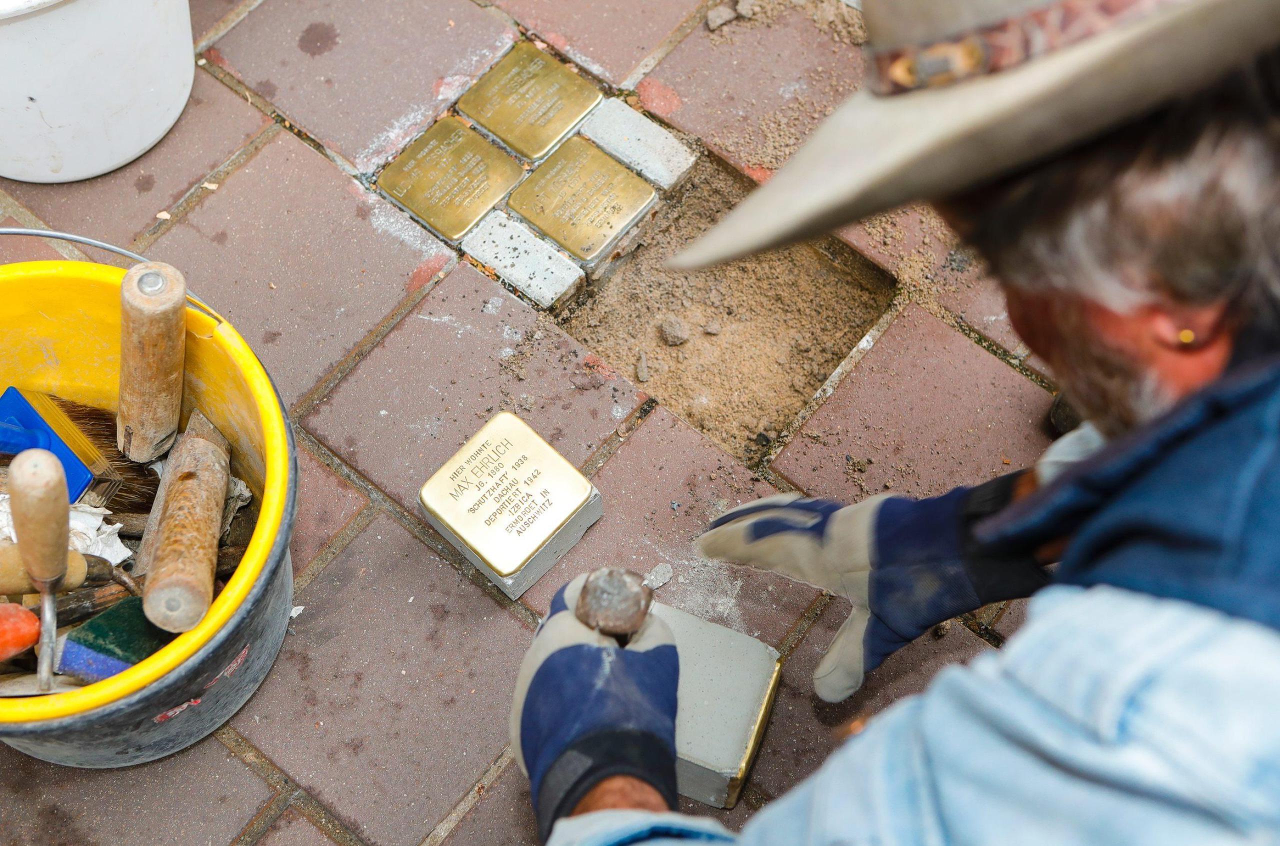 Zwischen Eimern und nassem Sand liegen zwei etwa faustgroße Steine mit Goldtäfelchen auf der Oberseite. Nach kurzer Zeit ist das alte Betonfundament dank Hammer und Meißel entfernt und durch Zement ersetzt. Vorsichtig setzt Michael Panzer die Quader ins Pflaster, richtet sie aus und betoniert sie fest.