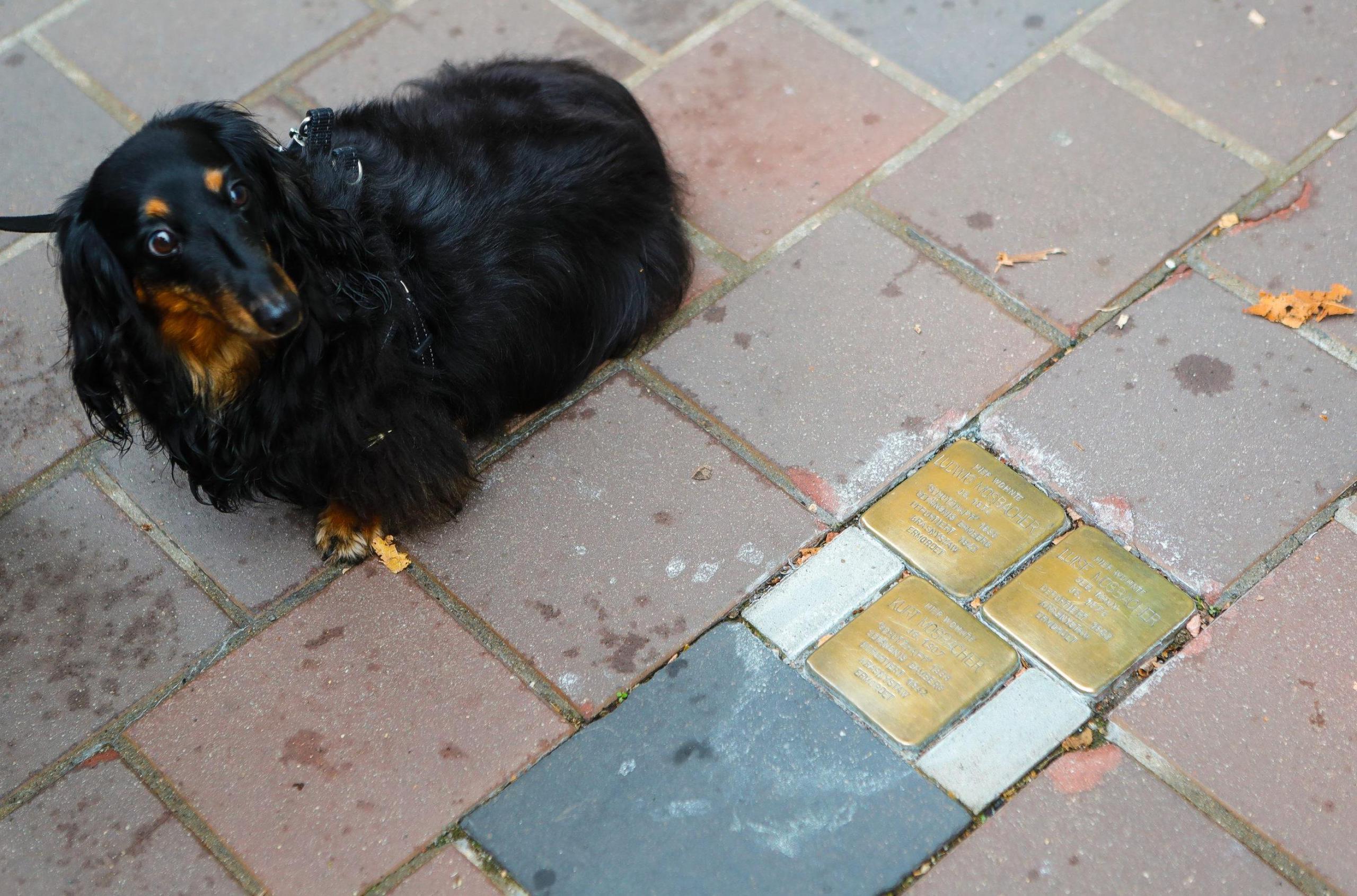 Die beiden schimmernden Tafeln heben sich deutlich von ihrer rotbraunen Umgebung vor dem Gebäude, das 1939 als Judenhaus bezeichnet wurde, ab.