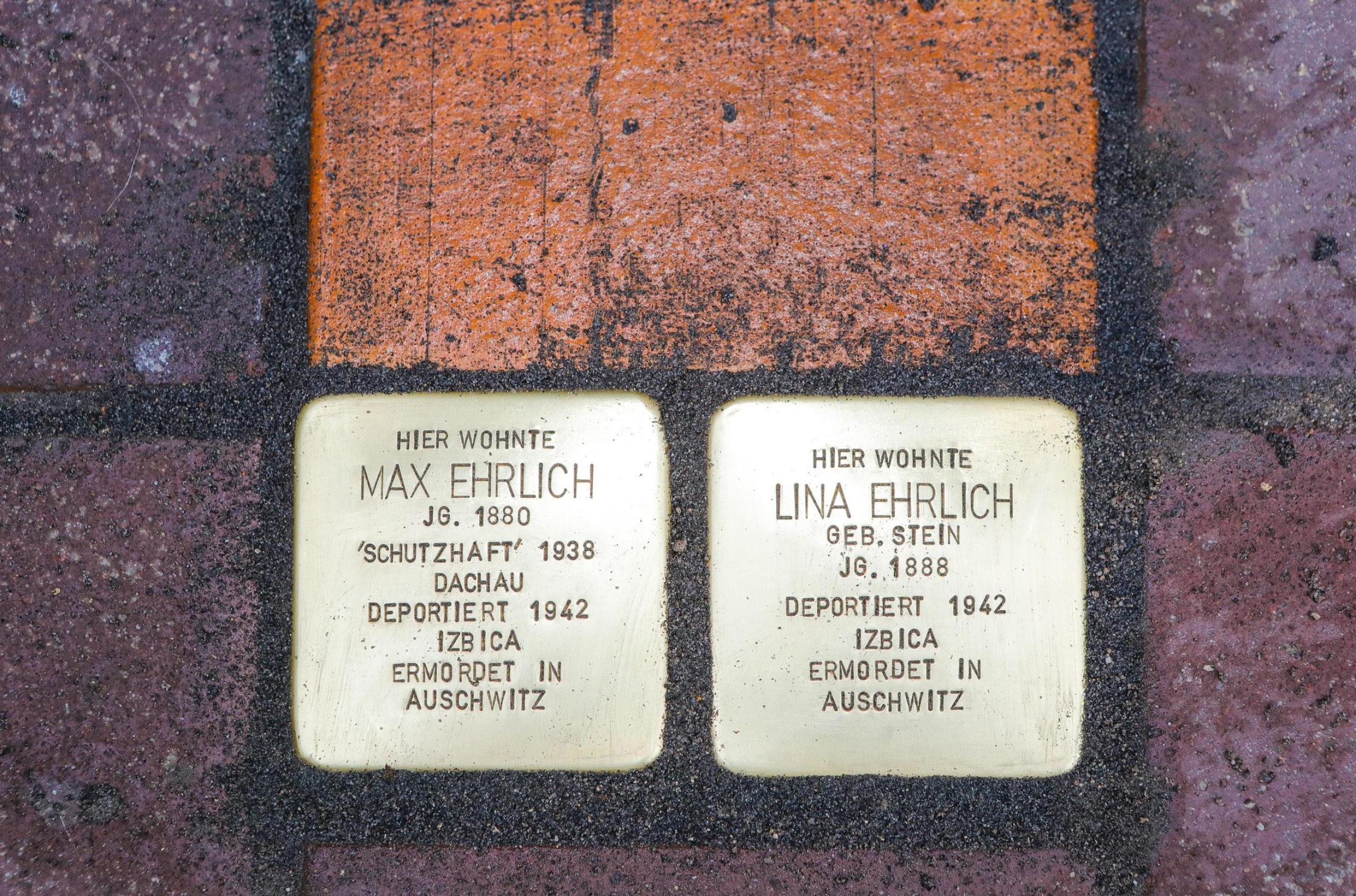 Die beiden schimmernden Tafeln heben sich deutlich von ihrer rotbraunen Umgebung vor dem Gebäude, das 1939 als Judenhaus bezeichnet wurde, ab.Hier wohnte das Ehepaar Ehrlich, bis es von den Nazis verschleppt und ermordet wurde. 156 Stolpersteine erinnern mittlerweile in Bamberg an Juden, die Opfer des NS-Regimes wurden.